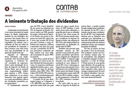 JC-RS publica artigo do diretor da FENACON sobre iminente taxação de dividendos
