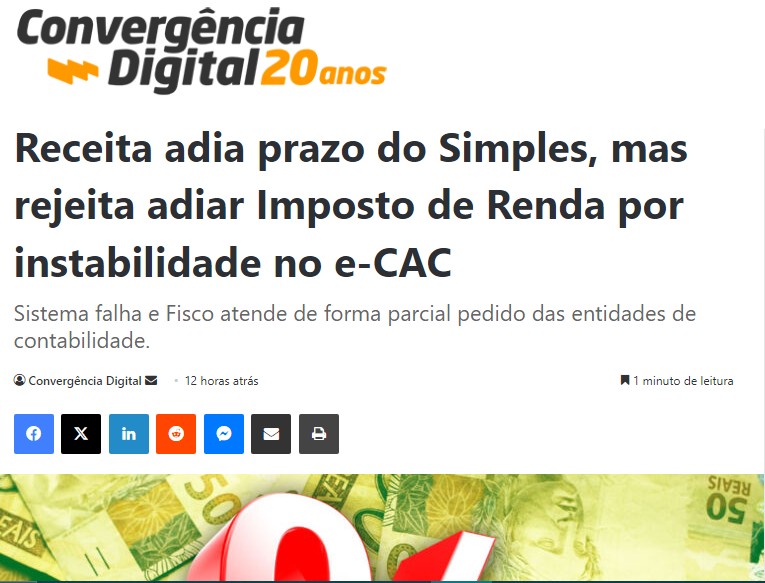 A Receita Federal, por conta das instabilidades percebidas no e-CAC desde o dia 20 de maio, adiou o prazo de pagamento do Simples Nacional, e vai anunciar uma nova data. Mas rejeitou adiar o prazo para o fim da entrega das declarações do Imposto de Renda, no dia 30 de maio.
