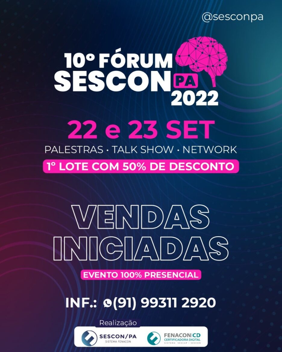 A 10ª edição do Fórum SESCON-PA está confirmada para os dias 22 e 23 de setembro, de forma 100% presencial. Será no Belém Hall, com palestras e talk show; além de um excelente espaço para networking.