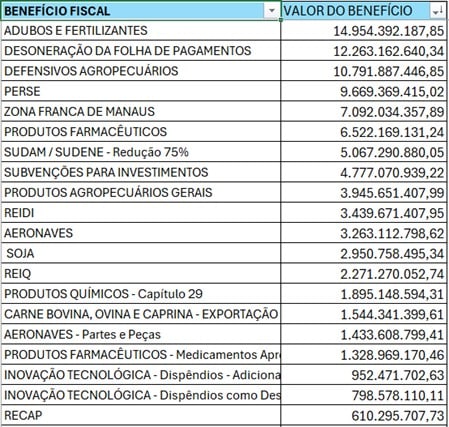 Confira abaixo detalhamento dos maiores valores por benefício fiscal