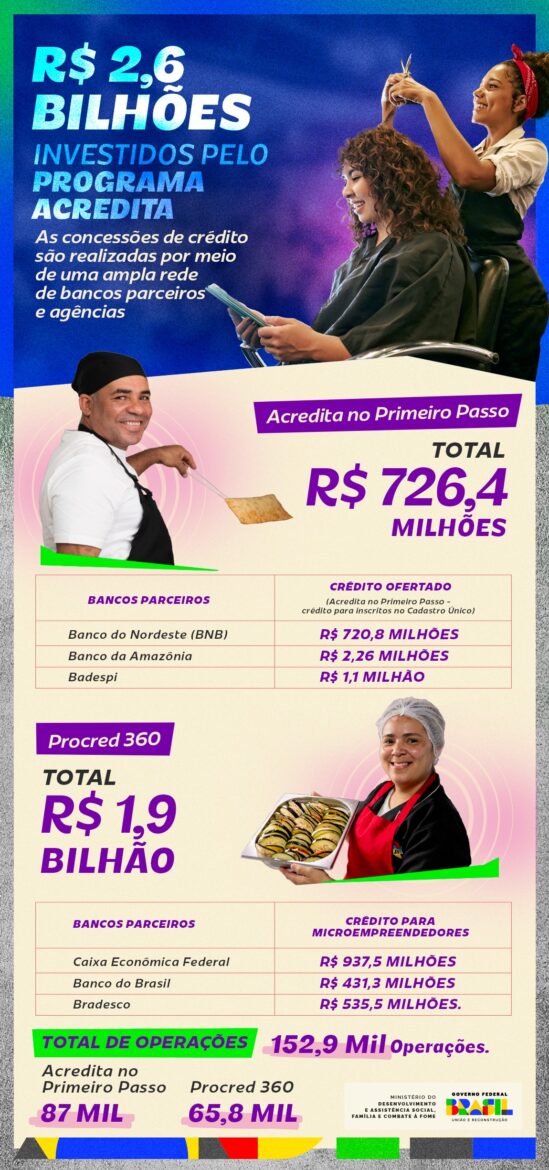 Criar oportunidades e impulsionar negócios. Essas são as principais metas do Programa Acredita, lançado em 2024 pelo Governo Federal. A iniciativa auxilia as pessoas que desejam empreender, mas que ainda encontram barreiras no acesso ao financiamento. Até o momento, o programa já viabilizou R$ 2,63 bilhões em crédito, totalizando 152,9 mil operações.