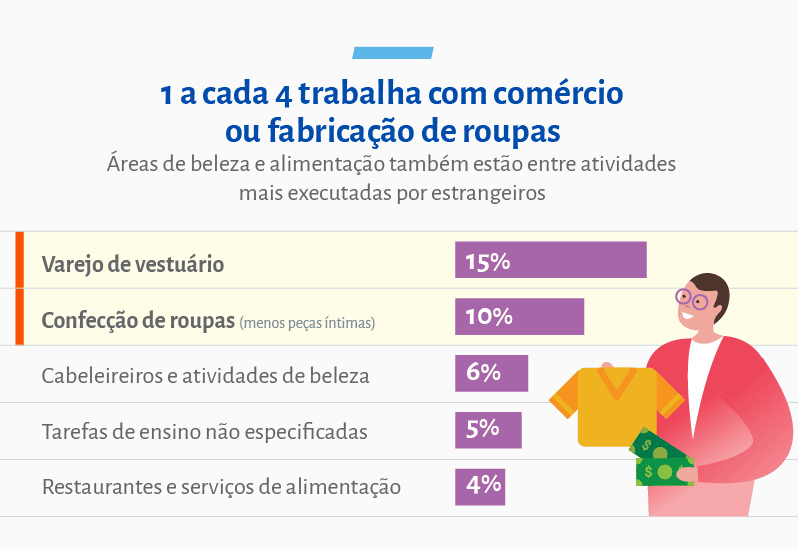 O estudo realizado pelo Sebrae, com base em dados da Receita Federal de maio de 2023, também apurou as atividades em que os empreendedores estrangeiros mais atuam. Um a cada quatro trabalham com comércio ou fabricação de roupas. A área da beleza também está entre as mais procuradas, com um universo de 6% de estrangeiros, seguida pela de atividades de ensino, com 5%, e alimentação e bebida, com 4%. Entre as dez nacionalidades que mais têm estrangeiros empreendedores no Brasil, sete são da América Latina. Juntos, Venezuela, Bolívia, Colômbia, Argentina, Uruguai, Peru e Uruguai concentram 56% dos MEI estrangeiros.