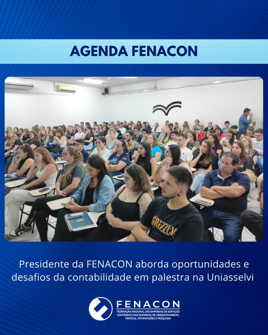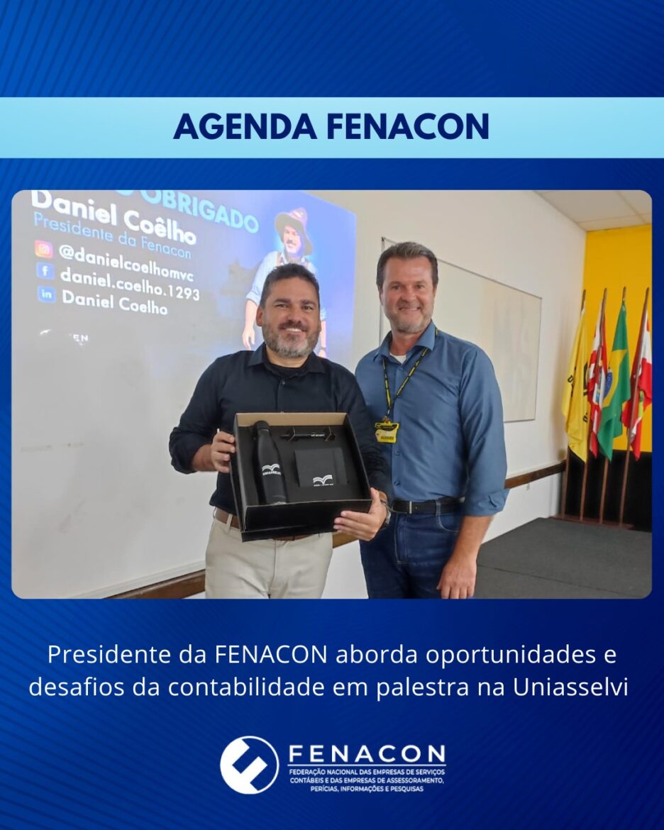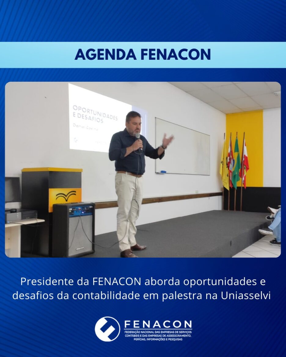 No mesmo dia, Daniel Coêlho palestrou na Uniasselvi sobre evolução e excelência na profissão contábil, oportunidades e desafios. Na explanação, o especialista abordou tendências para a contabilidade e apresentou um pouco da atuação da FENACON na defesa dos interesses da categoria.