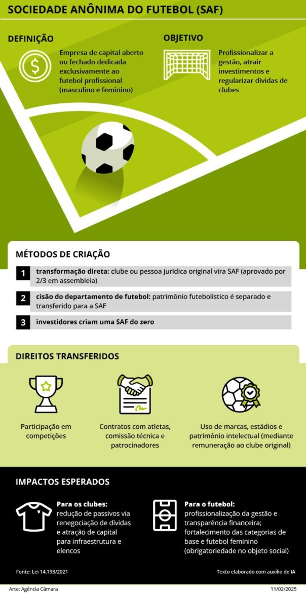 Outros pontos do projeto são: permite a conversão de dívida com credor em ações da SAF, desde que aprovado pela assembleia geral de acionistas; e as ligas de futebol também poderão se organizar como SAF.