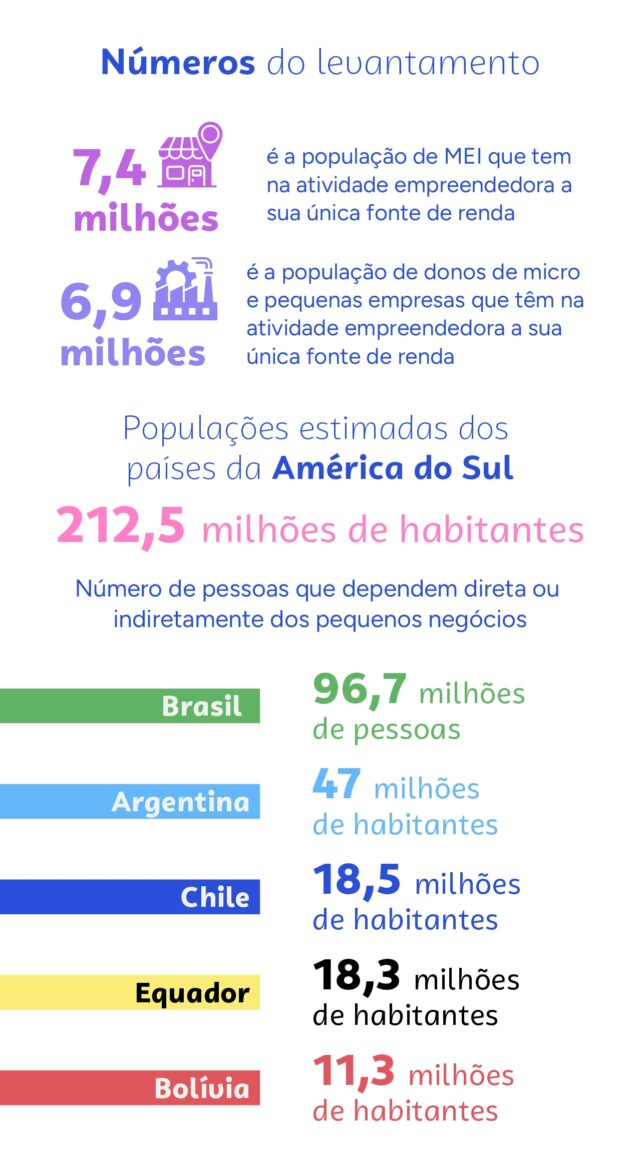 De acordo com o levantamento, considerando o universo de donos de negócio (microempreendedores individuais e micro e pequenas empresas) que têm na atividade a única fonte de renda e o tamanho médio das famílias desses empreendedores, o Brasil teria uma população de 43,7 milhões de pessoas diretamente dependentes da fonte de renda gerada pela atividade empreendedora em 2024.