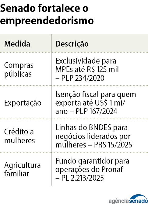 Os parlamentares também aprovaram medidas para beneficiar micro e pequenas empresas. O PLP 234/2020, do senador Chico Rodrigues (PSB-RR), amplia a participação dessas empresas nas compras públicas ao estabelecer exclusividade em licitações de até R$ 125 mil. A proposta está na Câmara e aguarda por apreciação.