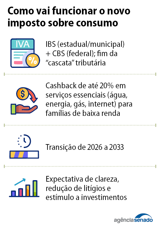 O novo modelo pretende acabar com a chamada “cascata de impostos” e dar mais transparência à cobrança tributária. Além disso, o sistema prevê devolução parcial de impostos (cashback) para famílias de baixa renda em serviços essenciais, como gás, energia elétrica, água e internet. A implementação será gradual, entre 2026 e 2033.