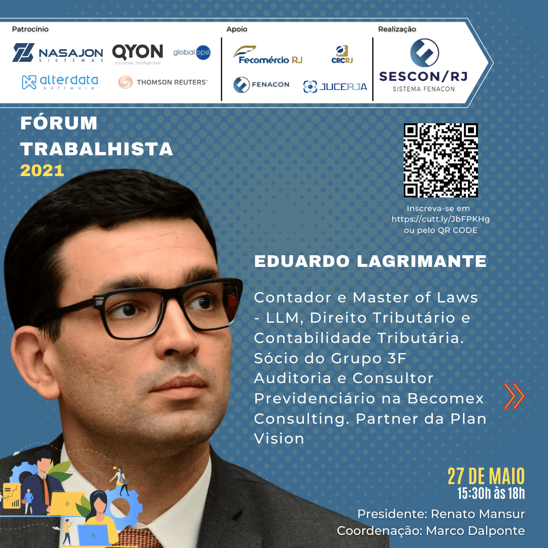 Eduardo Lagrimante: Contador e Sócio do Grupo 3F Auditoria e Consultor Previdenciário na Becomex Consulting – Atuação na Área de Auditoria e Consultoria previdenciária e trabalhista, gerenciando e realizando a gestão dos projetos e de equipe, sendo responsável pelo desenvolvimento e elaboração dos planos de trabalhos e estratégias em análises tributárias, trabalhistas e previdenciárias.