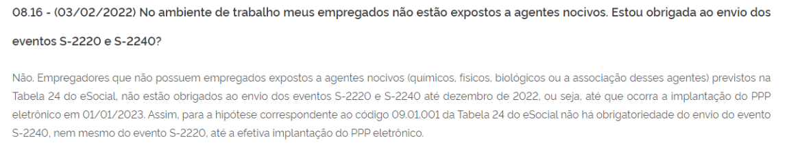 “Assim, para a hipótese correspondente ao código 09.01.001 da Tabela 24 do eSocial não há obrigatoriedade do envio do evento S-2240, nem mesmo do evento S-2220, até a efetiva implantação do PPP eletrônico”, reforça a página.