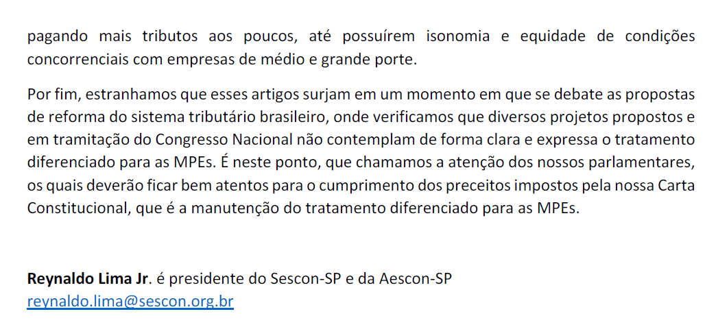Presidente do SESCON-SP, Reynaldo Lima Jr, se manifesta em favor das micro e pequenas empresas, destacando a imensa contribuição que estes negócios trazem ao país e os grandes ataques que sofrem, em razão de possíveis benesses fiscais e tributárias. Confira o artigo abaixo: