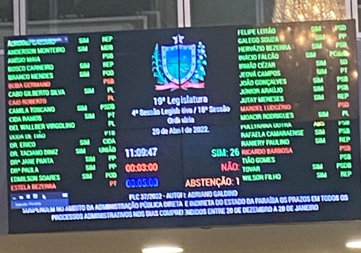 Foi votado na última quarta-feira (20/04), em sessão ordinária da ALPB, o Projeto de Lei Complementar 37/2022, de autoria do deputado estadual Adriano Galdino, que suspende, no âmbito da Administração Pública Direta e Indireta do Estado da Paraíba, os prazos em todos os processos administrativos nos dias compreendidos entre 20 de dezembro e 20 de janeiro.