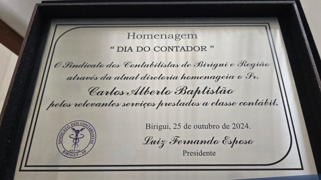 Na mesma ocasião, Baptistão foi homenageado pelo Sindicato dos Contabilistas de Birigui, representado por Luiz Fernando Esposo, pelos serviços prestados à classe contábil.
