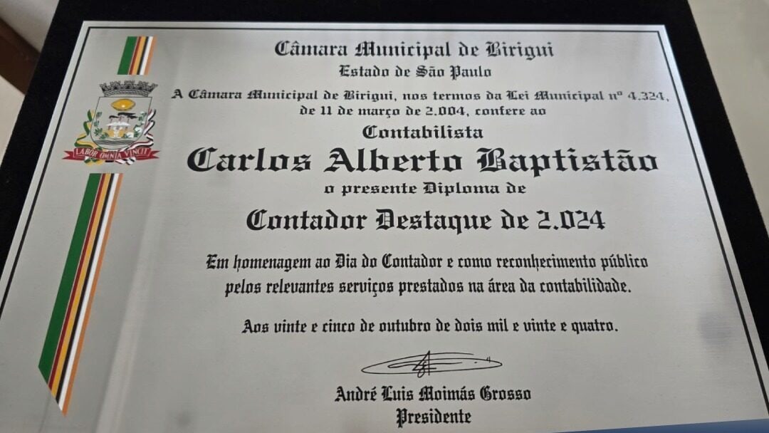 Na sexta-feira, 25 de outubro, a Câmara Municipal de Birigui realizou uma sessão solene, por iniciativa do presidente André Luis Moimás Grosso, para celebrar o Dia do Contador. A cerimônia homenageou profissionais que se destacaram por sua dedicação e contribuição à comunidade contábil, entre eles o presidente do Sescon-SP, Carlos Alberto Baptistão, e os contadores Erica Regina Rodrigues Giovani e Rodrigo Zucolotto Fredericho, que receberam o “Diploma Contador Destaque 2024” em reconhecimento ao compromisso com a profissão.
