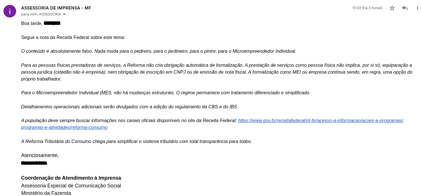 Em nota enviada à Lupa, o Ministério da Fazenda informou que o conteúdo é completamente falso e que não há alteração para pedreiros, jardineiros, pintores e microempreendedores individuais (MEIs). Para as pessoas físicas prestadoras de serviços, a reforma não cria obrigação automática de formalização.