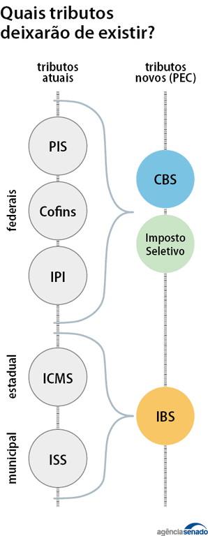 Os impostos federais IPI, PIS e Cofins serão transformados na Contribuição sobre Bens e Serviços (CBS). Já o imposto estadual ICMS e o imposto municipal ISS serão unificados no Imposto sobre Bens e Serviços (IBS). A tributação será feita apenas no local de destino, o objetivo é acabar com a chamada “guerra fiscal” entre os estados.