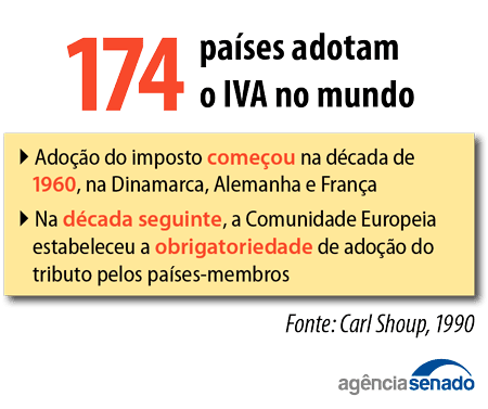 O mundo começou a adotar impostos tipo IVA na década de 1960, em países como França, Alemanha e Dinamarca. Com este sistema, o consumidor saberá exatamente quanto estará pagando de impostos no preço final de um produto.